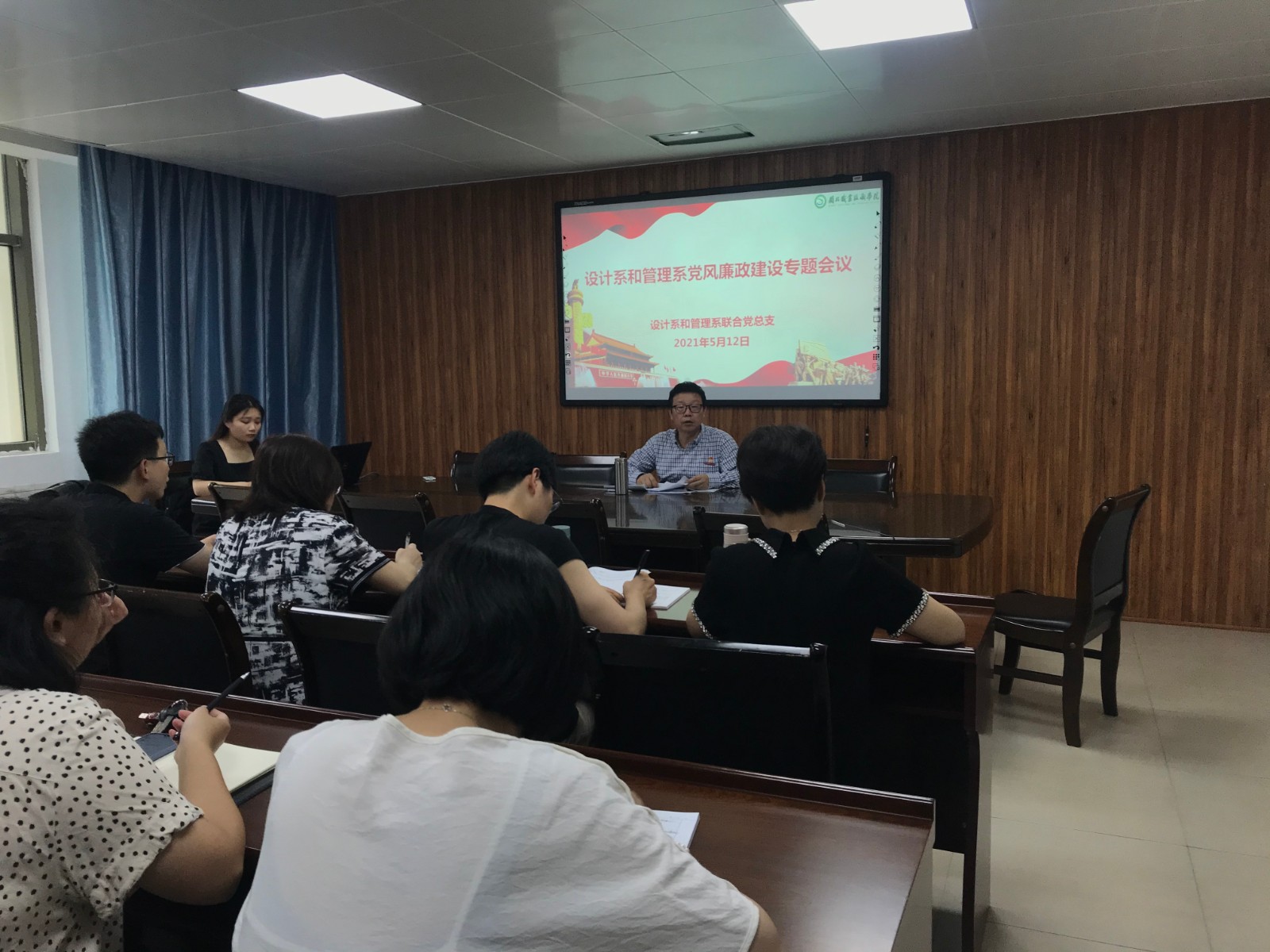 2021年5月12日下午,设计系和管理系联合党总支在行政楼507会议室召开党风廉政建设专题会议。会议由设计系和管理系联合党总支书记詹茂光主持,设计系和管理系全体党员、科室负责人、辅导员、专业主任参加了会议。