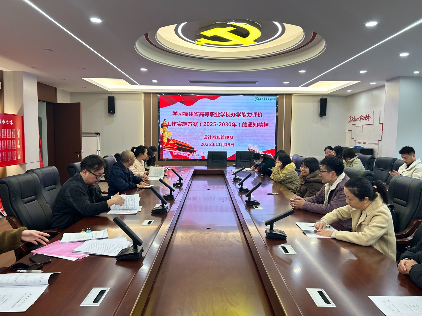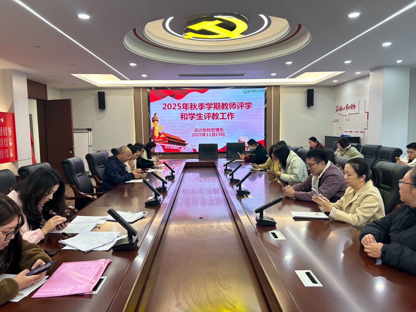 2025年11月19日,设计系与管理系在宝龙楼党员会议室开展学习会,会议由系主任白雁飞主持,两系全体教职工参加。