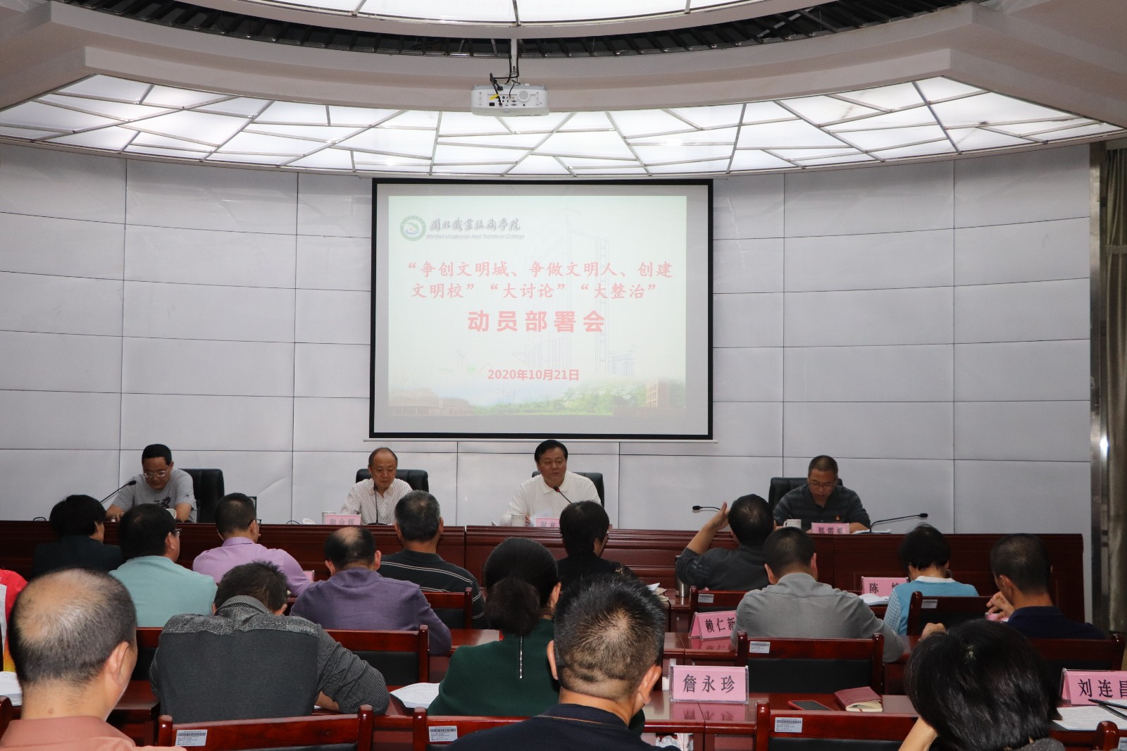 10月21日下午,学院在行政楼一楼报告厅召开“争创文明城、争做文明人、创建文明校”“大讨论”“大整治”动员部署会,学院副科级以上领导干部、各党总支委员、辅导员等参加会议,院党委书记谢友平在会上作了动员部署。