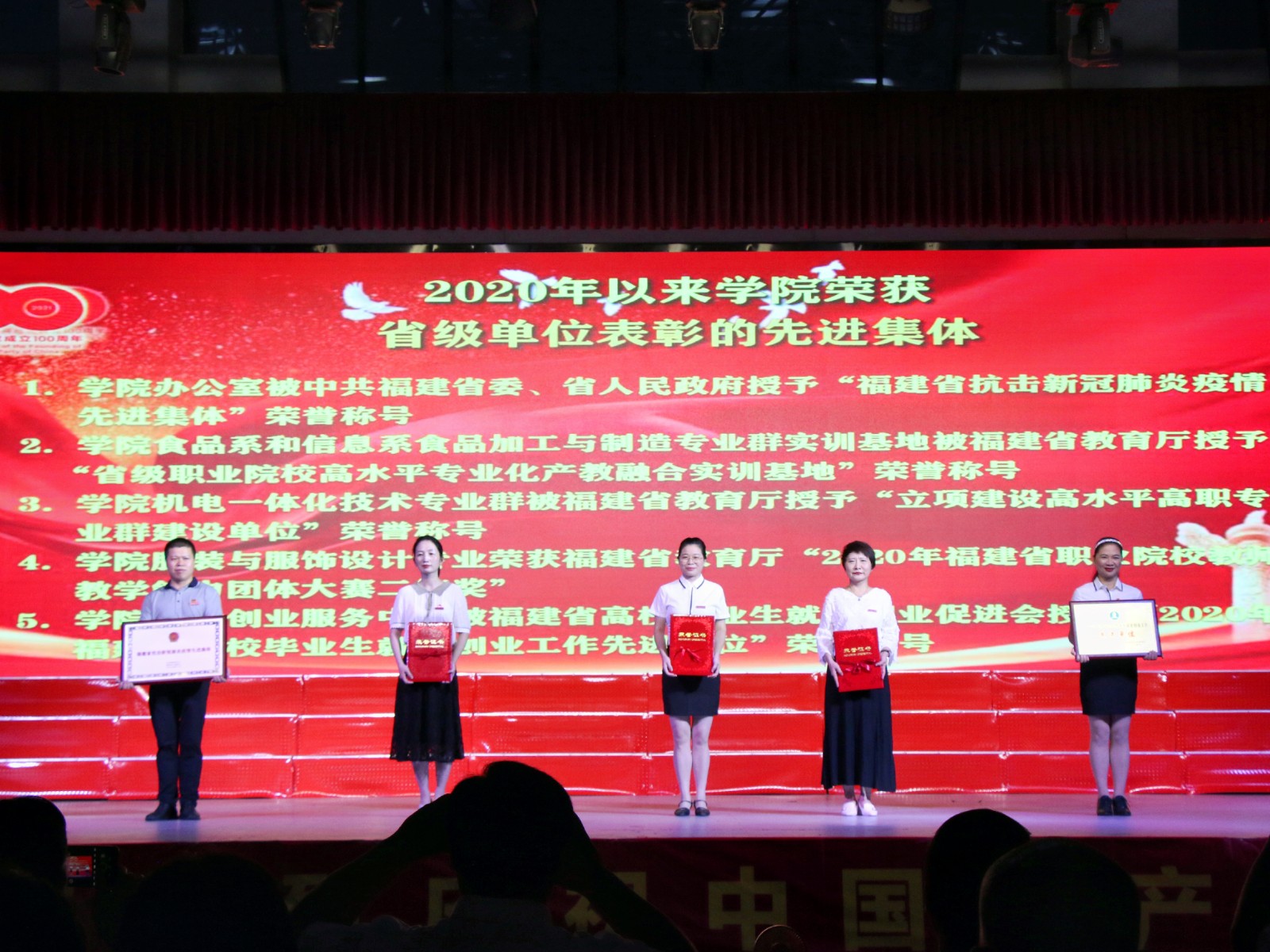 在中国共产党成立100周年之际,闽北职业技术学院“光荣在党50年”纪念章颁发仪式和获奖先进集体个人表彰活动在体育实训中心举行。