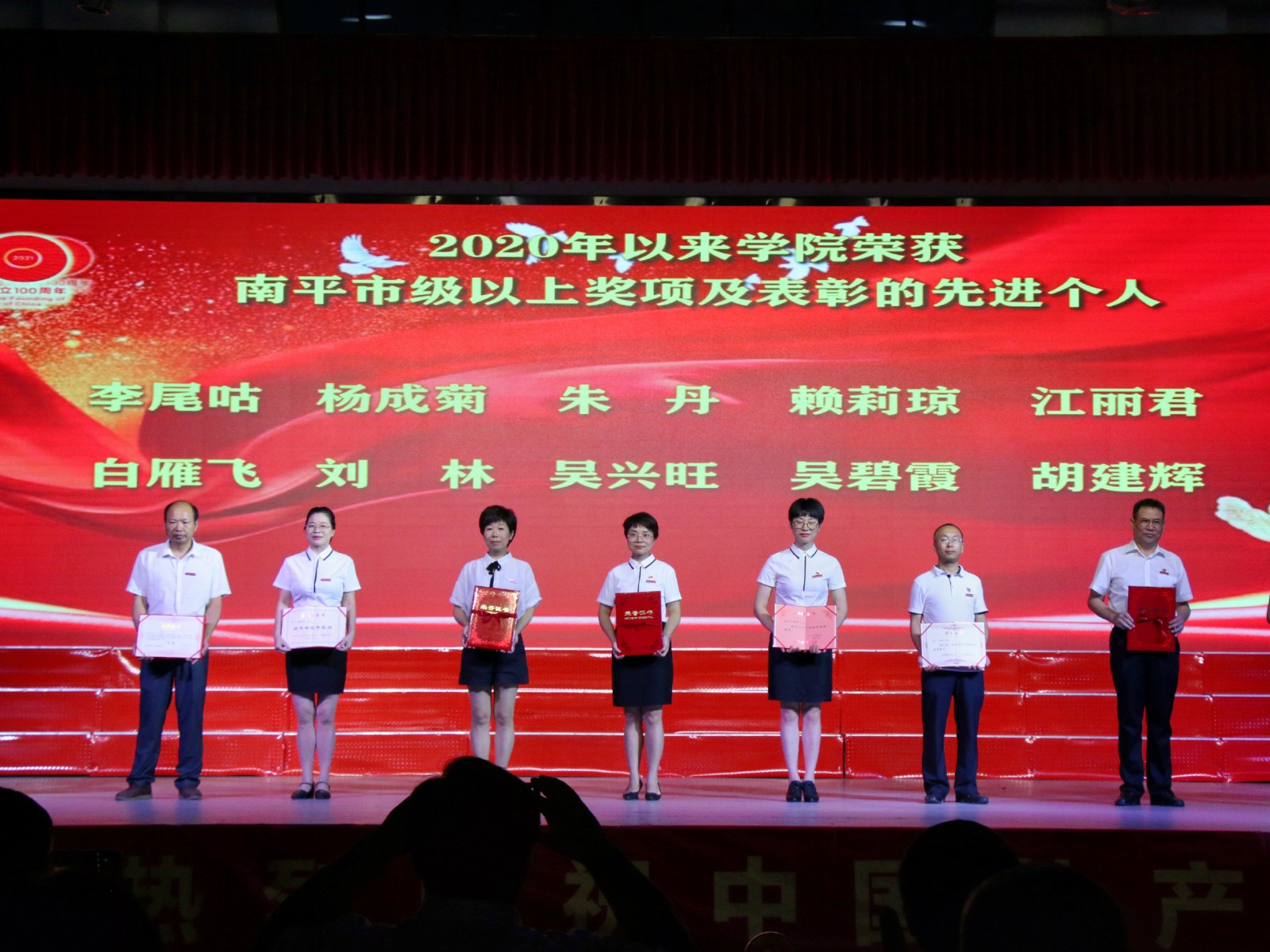 最后,学院表彰了荣获“一先两优”荣誉称号的集体和个人。院党委副书记陶金辉宣读了《中共闽北职业技术学院委员会关于表彰优秀共产党员、优秀党务工作者和先进基层党组织的决定》。院党委领导分别为获得表彰的“一先两优”对象颁发了荣誉证书。通过表彰活动的开展,进一步增强了党员的荣誉感、归属感、使命感,汇聚了全院广大党员干部和全体教职员工为实现“十四五”事业发展规划和2035年远景目标持续奋斗的磅礴力量,以榜样的力量引导广大师生听党话、感党恩、跟党走,以优异的成绩迎接中国共产党成立100周年。