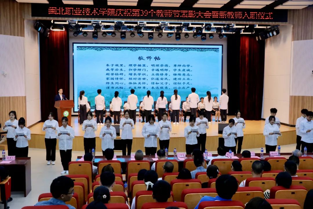 9月11日晚,闽北职业技术学院在学院多功能报告厅举行庆祝第39个教师节表彰大会暨新教师入职仪式。