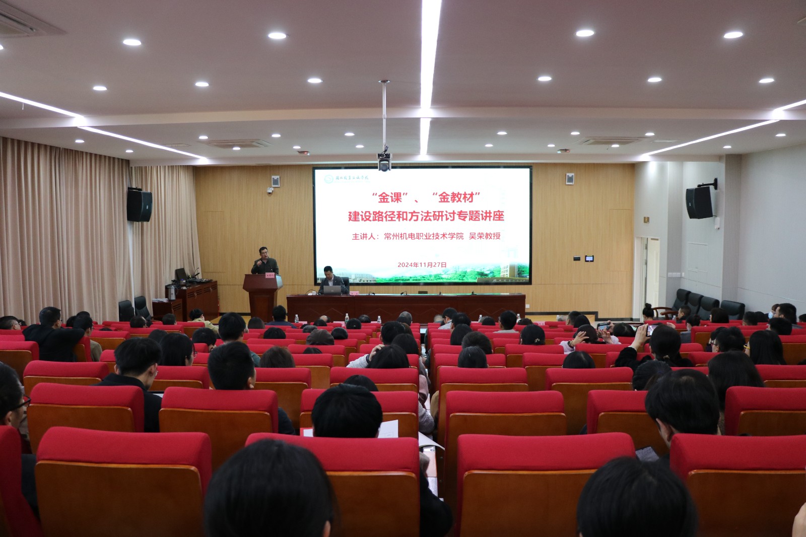 活动期间,学院邀请了常州机电职业技术学院教授吴荣为全体教师开展主题为《以终为始 以行致知 融合“成果导向-工作过程导向”的职业教育专业开发与课程教学》的知识讲座。吴荣教授以丰富的教学实践和比赛经验为基础,从成果导向的课程设计、工作过程导向的课程设计、两者的关联性、建构岗学教评的一致性、职业教育在线课程建设与教材建设等方面深入剖析了提升课堂教学实效,打造金课,建设数字教材的有效途径和方法,兼具理论高度和实践深度。