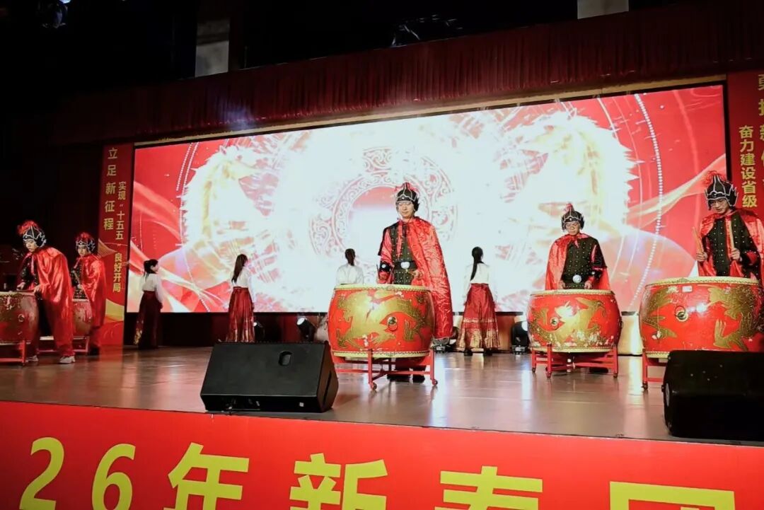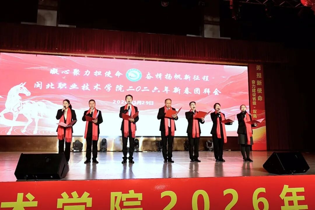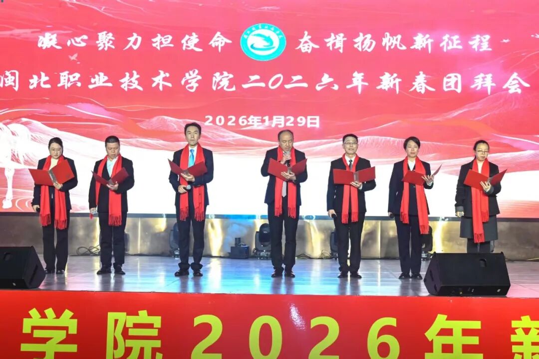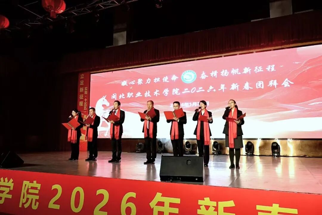 策马扬鞭启新程,同心筑梦谱华章。1月29日,“凝心聚力担使命、奋楫扬帆新征程” 闽北职业技术学院2026年新春团拜会在体育实训中心举行。学院全体教职工欢聚一堂,共贺丙午马年新春,共话学校发展新篇。延平区委常委、宣传部部长范贤才,中国移动南平分公司党委书记、总经理高子斌,武警南平支队副支队长陈保顺,南平高速交警支队副支队长林晓剑,中国移动延平分公司总经理祝翔婕,中国联通延平政企校园团队总监黄廷涛,延平区夏道镇宣传委员陈梦娜,延平区夏道镇派出所副所长兰火明等应邀莅临现场,与大家共迎新春。