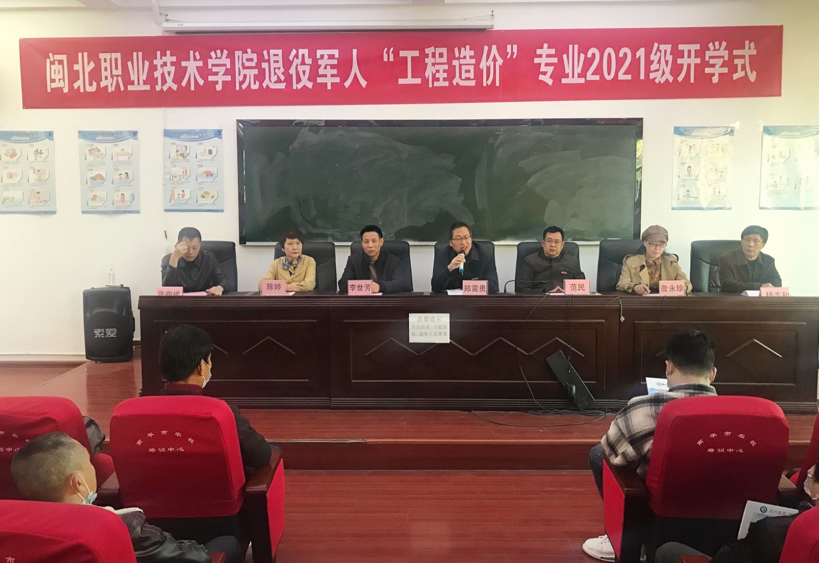 11月26日,在南平市建阳网际学校举行2021年退役军人新生入学仪式。51名被闽北职业技术学院管理系工程造价专业录取的退役军人新生进入校园求学,完成从军人到学生的华丽转身。学院副院长郑需勇、南平市退役军人事务局安置就业科科长李世芳、院教务处处长范民、院管理系系主任陈婷、招生与继续教育处副处长詹永珍、网际学校校长张曲斌等出席开学仪式,开学仪式由建阳网际学校校长张曲斌主持。