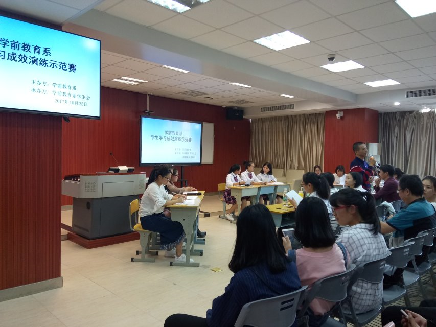 为了进一步提升学前教育系学生学习成效演练的整体水平,提高2017级新生对学习成效演练的认识,2017年10月25日,我系在实训楼一体化教室举办了以“自主创业”项目策划为主题的学习成效演练示范赛。该示范赛参加的选手是我系2016级学生骨干,系党总支叶常明书记、邱海松副书记和辅导员组成专家组,各新生班主任和新生代表到现场观摩学习。各小组以PPT演示汇报本小组的创业策划,现场回答专家评委的提问。