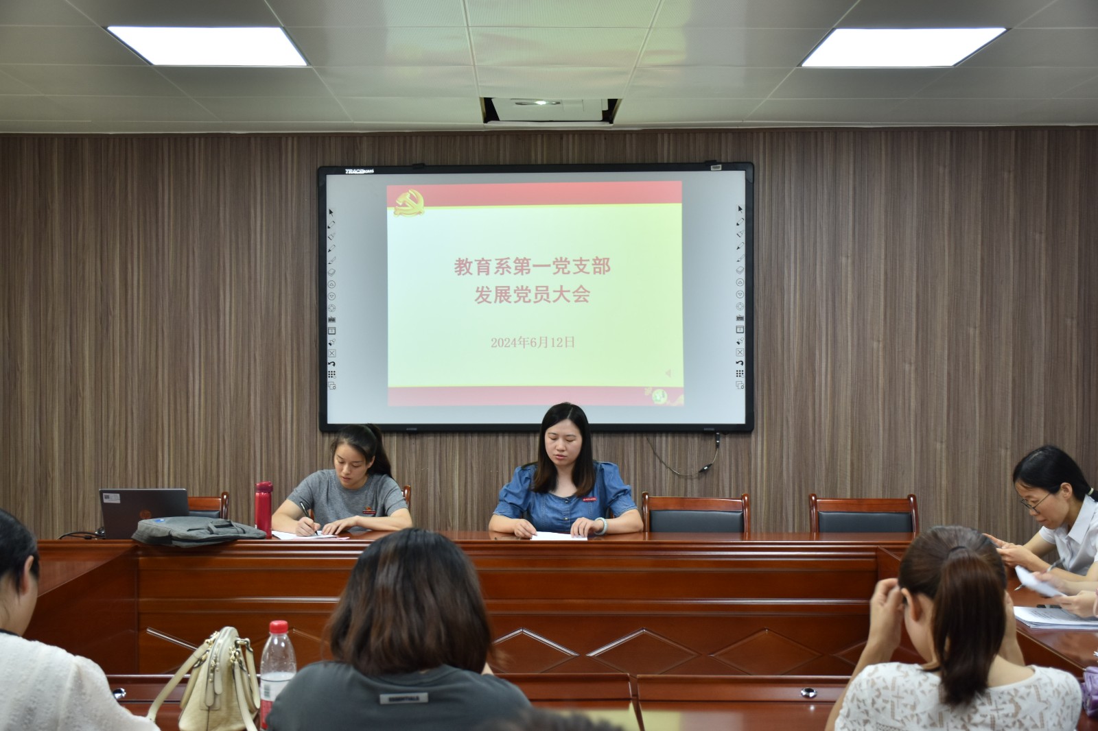 为响应党的号召,培养优秀共产党员,2024年6月12日下午,教育系第一党支部在行政楼607会议室召开预备党员吸收大会,参与本次会议的有教育系第一党支部所有党员以及8名拟吸收对象,会议由支部书记陈芷璇同志主持。