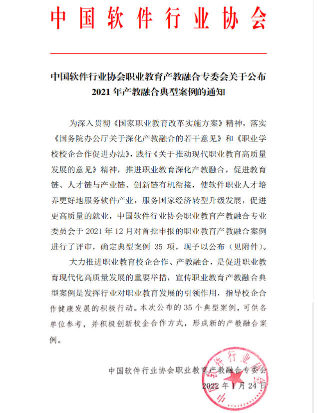 2021年12月,中国软件行业协会职业教育产教融合专委会发布《关于公布2021年产教融合典型案例的通知》。经过委员会的综合评审等程序,从首批申报的职业教育产教融合案例中确定典型案例35项。其中,我校软件学院的“产教深度融合、校企双元共赢,‘五共融合、六业同频’人才培养模式探索与实践”