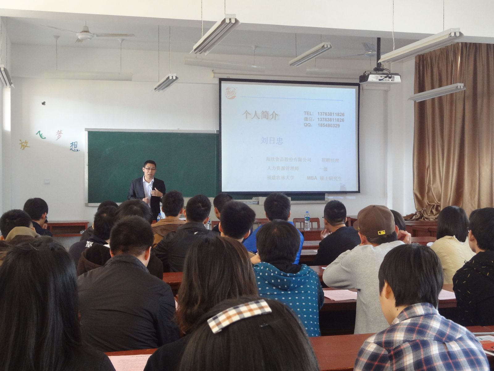 为拓宽毕业生的就业渠道,保障毕业生的实习与就业质量,我系11月19日邀请了福建圣农集团、海欣食品股份有限公司参加校内企业宣讲暨2015届毕业生校园招聘会。