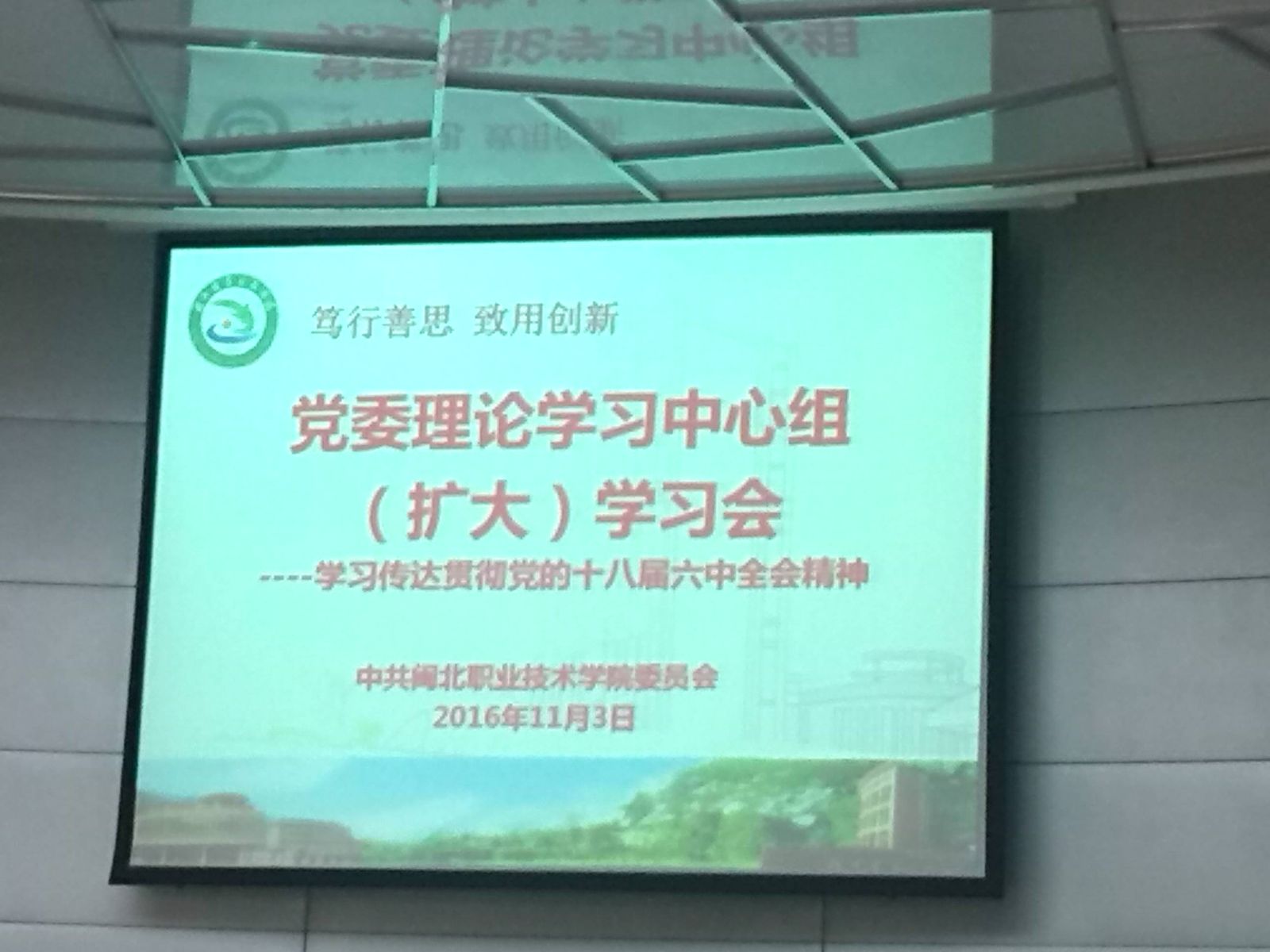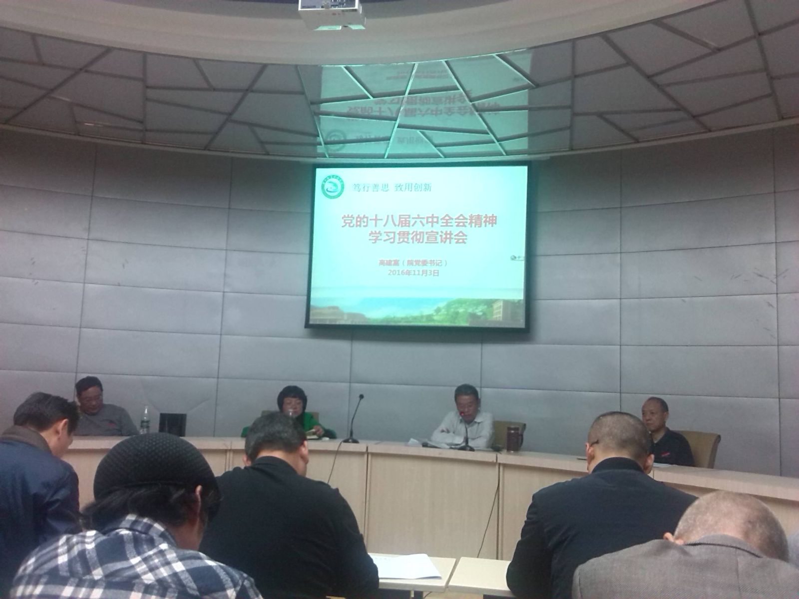 2016年11月3日下午,院中层以上领导(含后备干部)、各党总支委员、支部书记参加了院党委理论学习中心组(扩大)学习会,学习传达贯彻党的十八届六中全会精神,会议分两个专题,第一专题为院党委高建富书记的“党的十八届六中全会精神学习贯彻宣讲会”,第二专题为院党委陶金辉副书记的“学习《胡锦涛文选》学习宣讲会”,通过两个专题的学习,为我系下一阶段“两学一做”的深入开展明确了方向,也为我系第二轮评估工作的进一步深化提供了前行的动力。参加本次大会的我系老师有:张金良主任、郑启阶副书记及鞠璐宁、黄妍等老师。