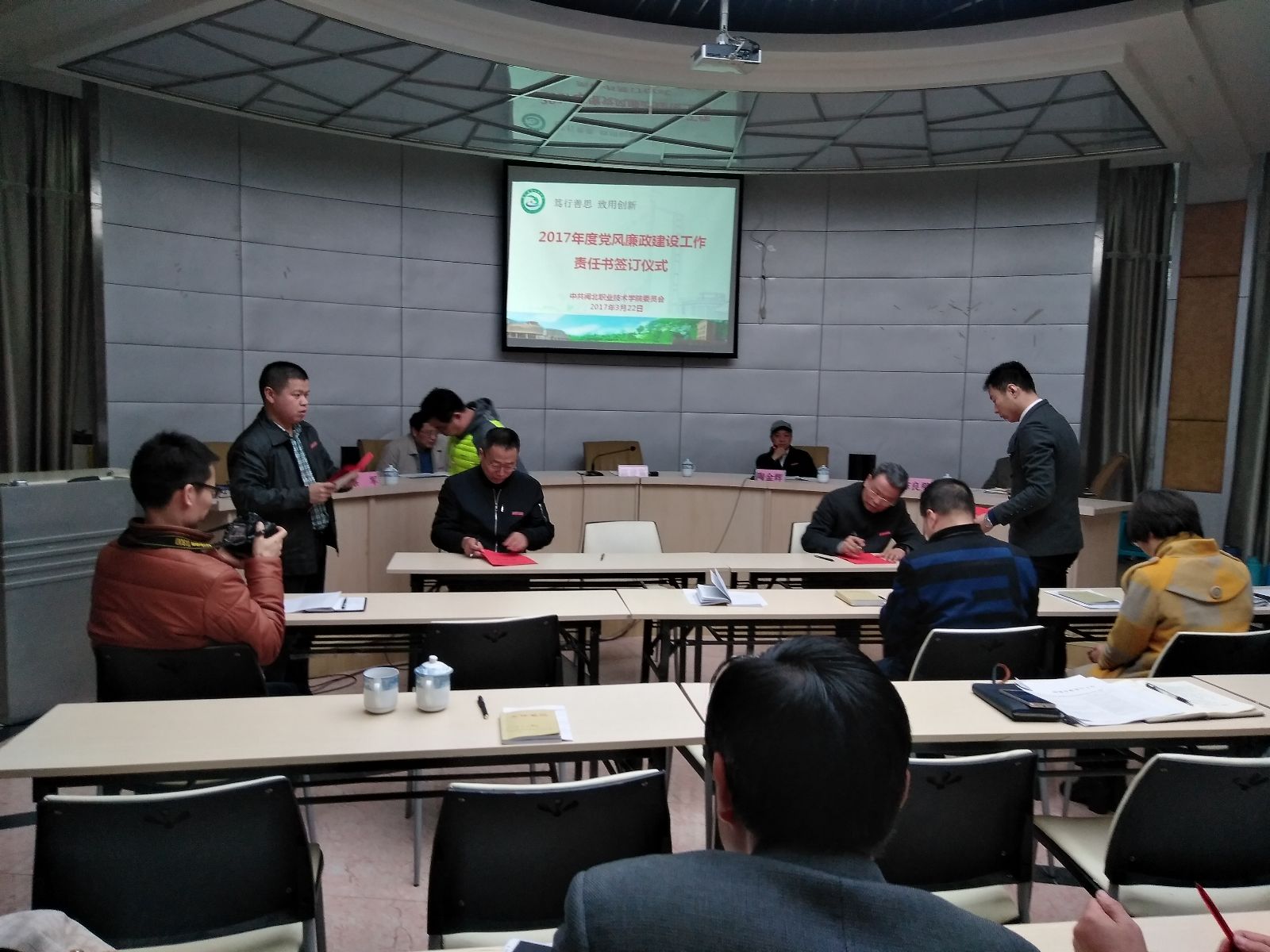 2017年3月22日下午,我院召开了2017年度党风廉政建设工作会议。会议由陶金辉副书记主持,纪委姚荣书记及院党委高建富书记作了重要讲话。姚书记从“严明党的纪律,抓党纪法规教育”、“明确纪律规矩,抓规章制度建设”等六个方面回顾总结了2016年我校党风廉政建设工作开展情况,同时对我院2017年党风廉政建设工作进行了部署。会上,姚书记要求各部门要切实做好今年的党风廉政建设工作,要加强制度建设,构建长效机制,发挥“1+X”的作用;同时要加强党内监督、严肃党内政治生活,做忠诚、担当、清廉、干净的好干部。院党委高建富书记在会上作了重要讲话,高书记从“统一思想认识,切实增强推进党风廉政建设和反腐败工作的责任感使命感”、“敢于责任担当,让全面从严治党责任落地生根”、“抓实抓长,不断推动党风廉政建设和反腐败工作取得新成效”等三大方面进行工作部署。高书记强调,党员干部要坚决维护党的集中统一和核心权威,要提高政治敏锐性,要讲政治纪律、讲政治规矩;要带头坚定理想信念,要带头主动接受监督,要带头落实真抓实干,敢于担当、乐于奉献,切实发挥先锋模范作用,为我院二轮评估多做贡献。高书记号召各级各部门要打赢“迎评工作”攻坚战,以优异成绩迎接党的十九大的召开。最后,高书记和各部门分别签订了2017年党风廉政建设责任书。参加本次会议我系领导有:系张金良主任,总支常务副书记郑启阶,支部书记鞠璐宁、黄妍等。