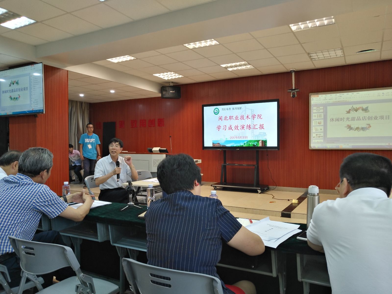 由我系曾小芸、李虹、廖红珍三位同学组成的代表队向大会作了题为“休闲时光甜品店创业项目”的学习成效演练汇报。演练汇报过程中,同学们的临场发挥得到了黄克安教授的高度好评。同时黄教授就学生学习成效演练对我系提了三点建议:一是学生学习成效演练要以学生为主体,教师参与为辅;二是要加强学生临场应变能力的训练;三是希望学生要沉着应对、生动活泼,要创新引领,也要有创业思想。