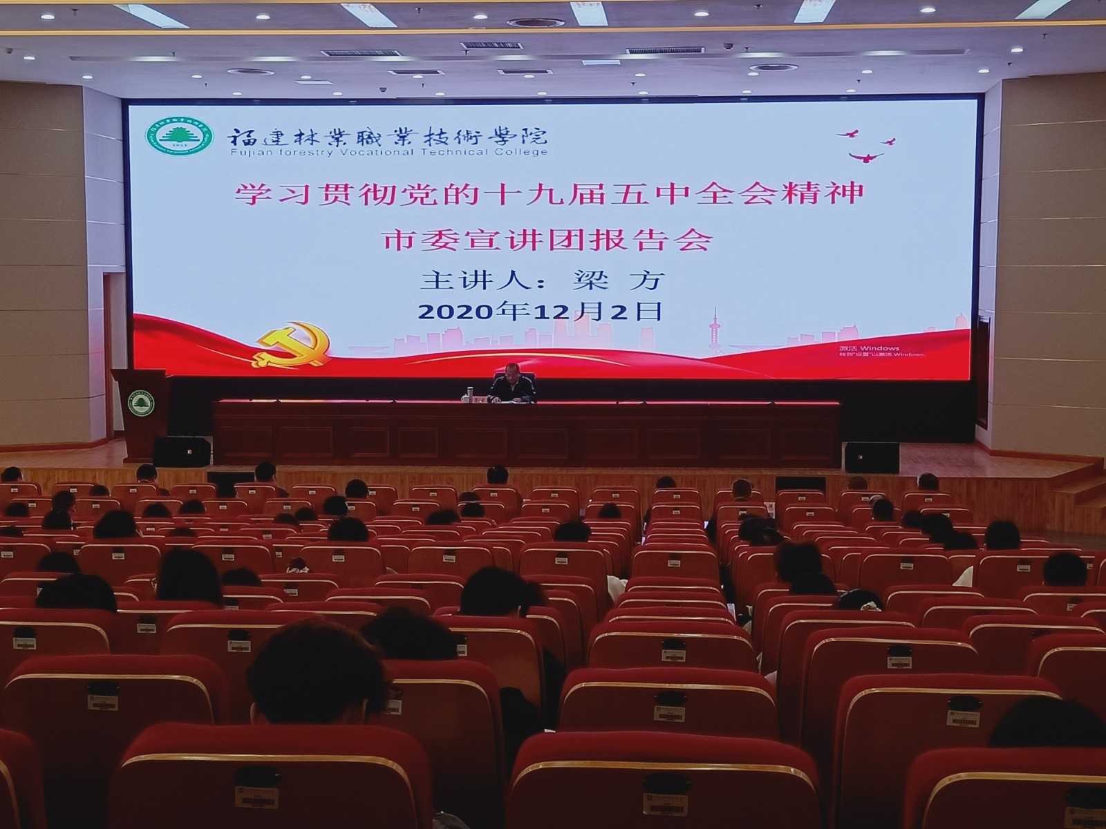 2020年12月2日上午,学院领导、干部教师以及学院“习近平新时代中国特色社会主义思想”读书社学生代表100多人到福建林业职业技术学院报告厅,参加了学习贯彻党的十九届五中全会精神市委宣讲团报告会。南平市委党的十九届五中全会精神宣讲团成员、市教育工委书记、市教育局局长梁方进行了宣讲。报告从深刻认识全会的重大意义,科学准确把握新发展阶段、深刻理解全会的重要内容,坚定不移贯彻新发展理念、深刻领会全会的战略部署,推动加快构建新发展格局、坚持党的全面领导,为实现全会擘画的宏伟蓝图提供根本保证四个方面,结合南平市“十三五”发展成就和“十四五”发展规划进行了了深入浅出的讲解。学习宣传贯彻党的十九届五中全会精神,是学院当前和今后一个时期的重要政治任务。学院将立即开展一系列宣传贯彻党的十九届五中全会精神的学习活动。