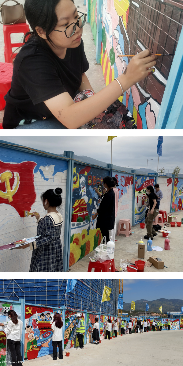 在此次活动中,院团委、设计系与管理系党总支、教育系党总支派出了党团员师生精干力量齐赴现场,与延平区少先队员代表、中建公司党员代表巧手齐心,共绘美图。在三天一夜的时间里,师生们在八十四平方的长墙上绘制了二十一幅美丽的画作,以自己的实际行动,喜迎党的二十大胜利召开,向盛会献上闽北职院党团员的期盼与祝福!