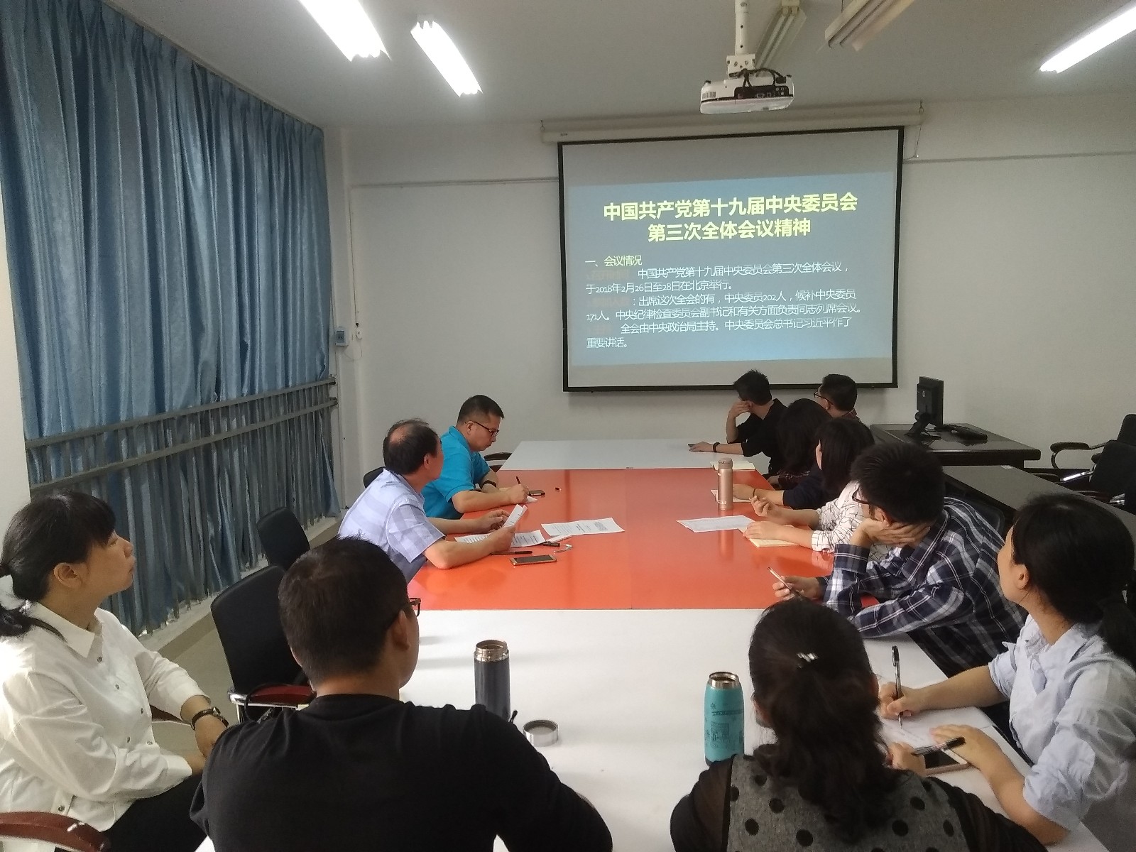 4月13日上午,我系党总支召开了全体党员、干部大会。会上,总支副书记郑启阶详细传达学习了中国共产党第十九届中央委员会第三次会议、中国共产党第十九届中央纪律检查委员会第二次全体会议的会议精神。与会党员、干部纷纷发表自己的体会,互相交流,讨论热烈,表示在今后的工作、学习中要紧密团结在以习近平同志为核心的党中央周围,把党的政治建设摆在首位,不忘初心、牢记使命,统一思想,统一行动,锐意改革,廉洁自律,确保完成各项工作、任务。