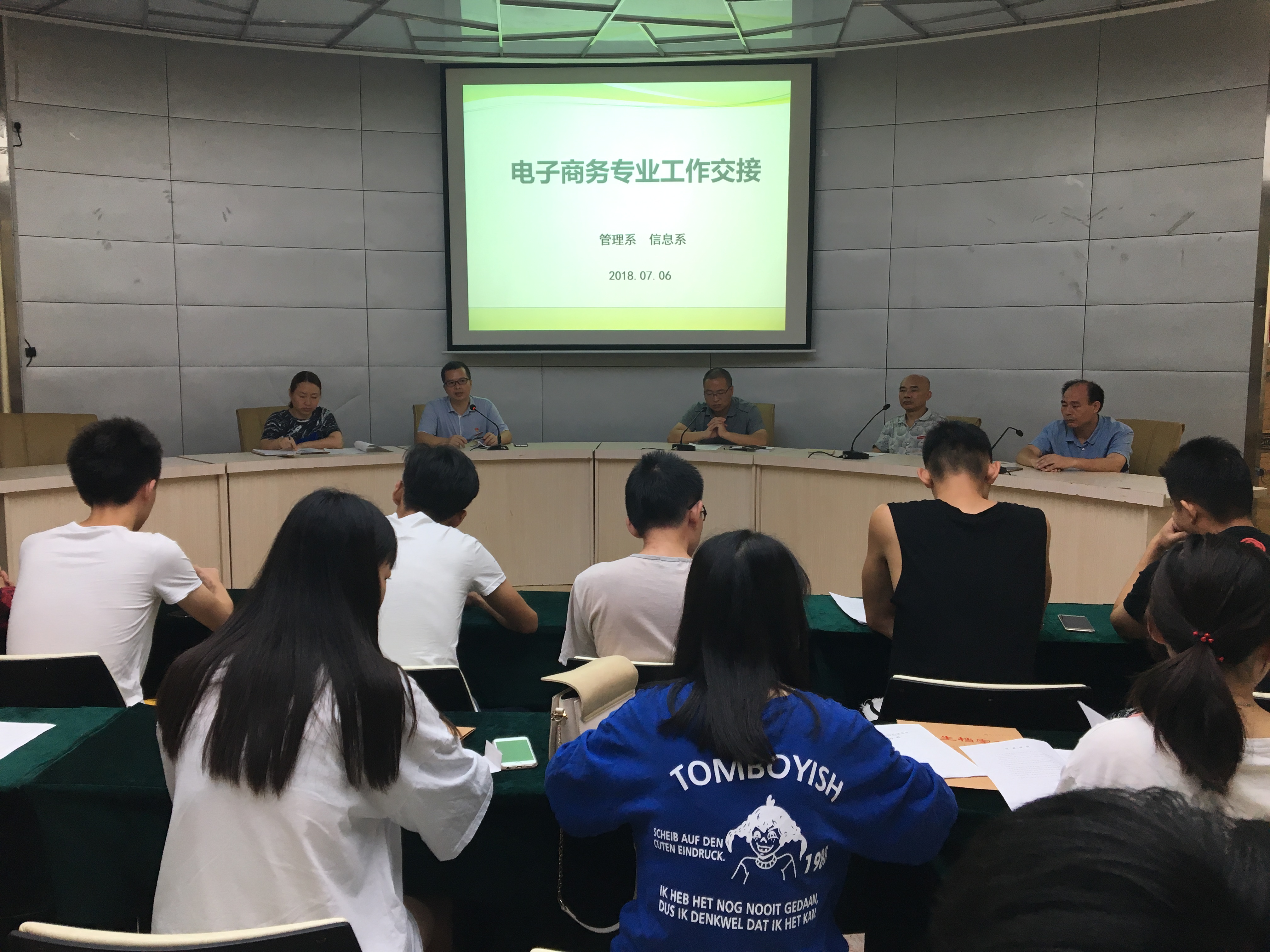 根据我院5月23日院长办公会议精神,我系积极响应学院将电子商务专业划转的工作部署,于7月6日上午与管理系举行了电子商务专业工作交接仪式,2016级、2017级电子商务专业全体学生参加,我系党政领导、学生科全体成员、教科办负责人、电子商务专业负责人等参加了交接仪式。