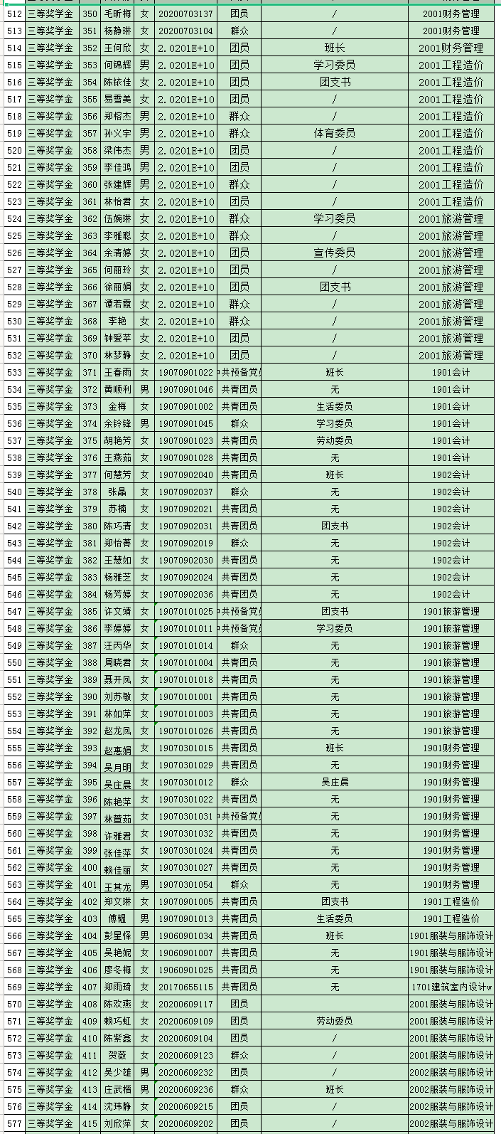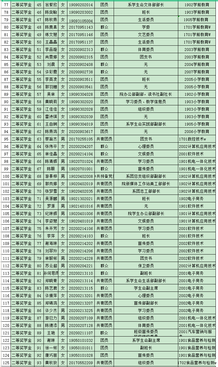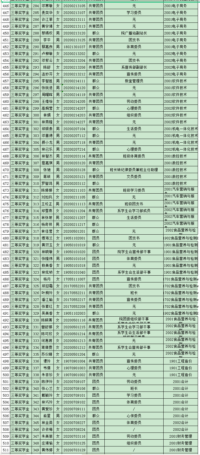 闽北职业技术学院2020-2021学年校级奖学金获奖学生名单公示