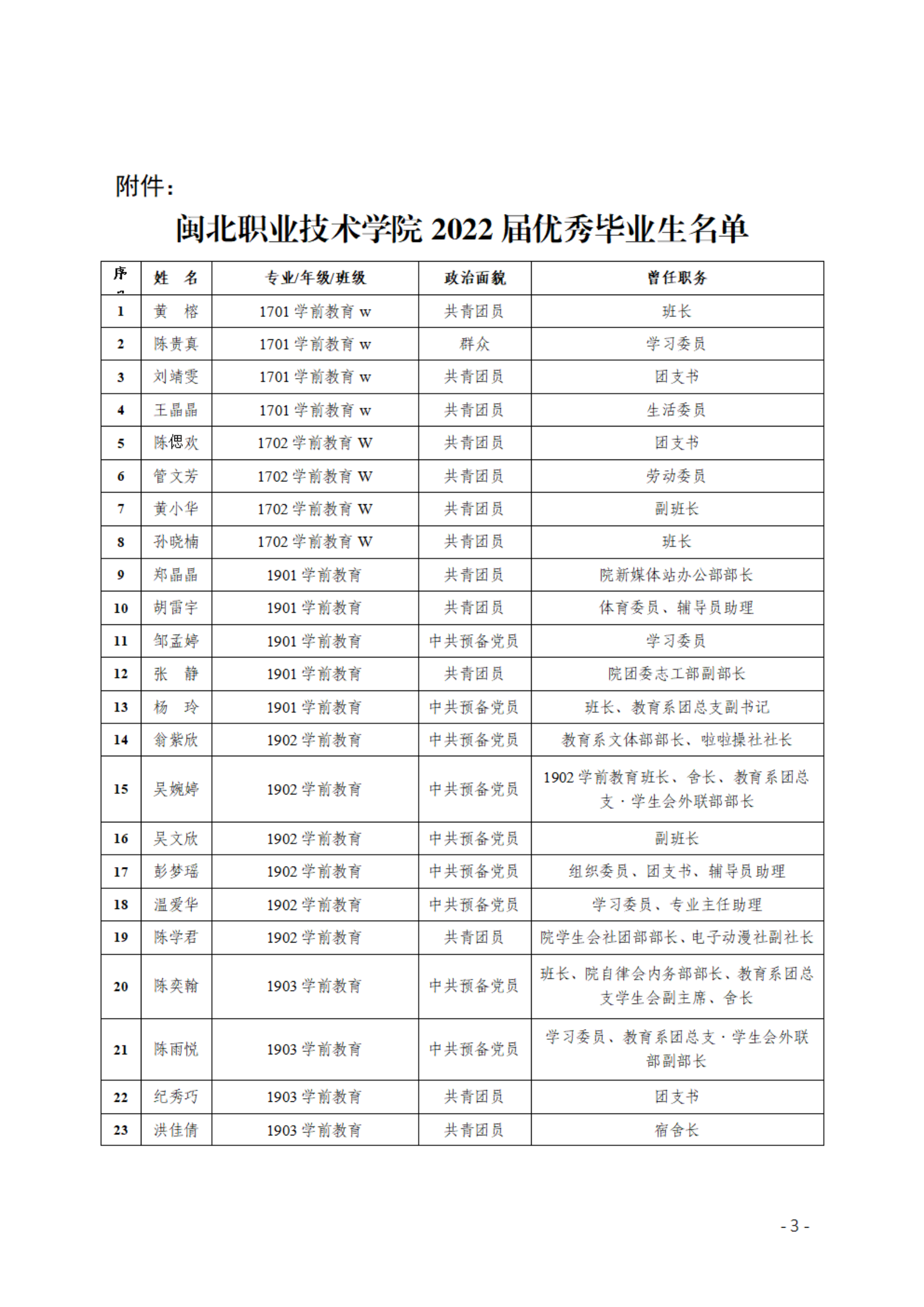 闽北职院关于授予黄榕等121位同学为2022届优秀毕业生的决定