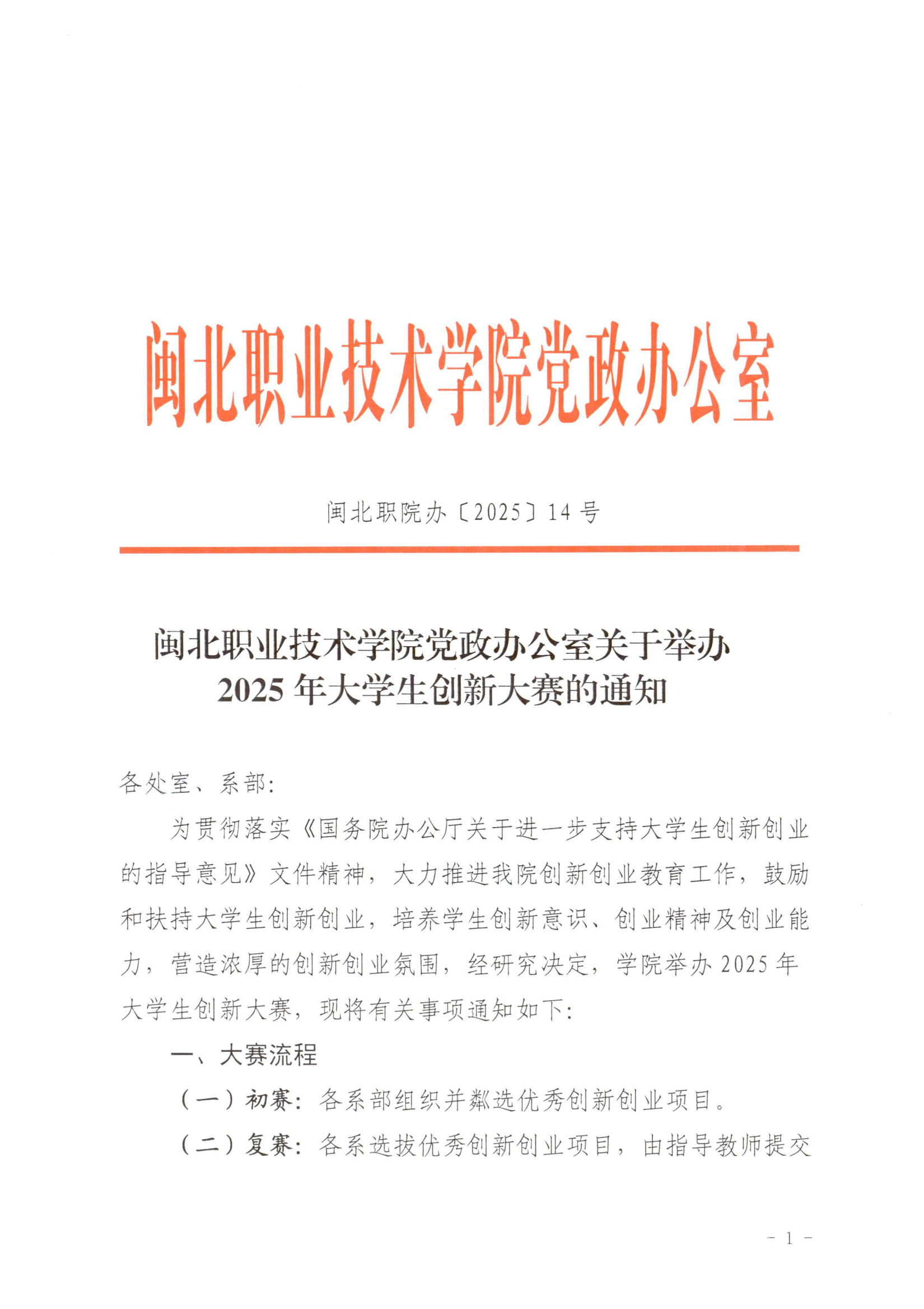 闽北职业技术学院关于举办2025年大学生创新大赛的通知
