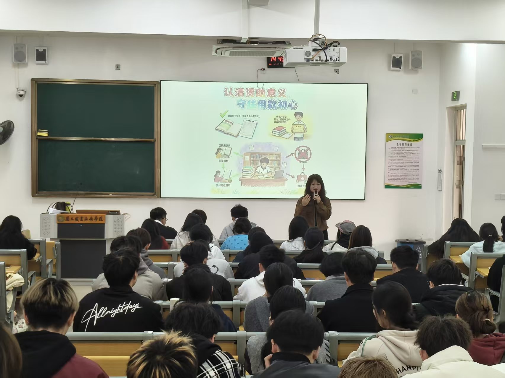 “助学金是国家和学校的暖心保障,更是学业提升的‘助推器’,每一分都要花在实处。”班会现场,辅导员们解读国家助学金政策核心,明确资金优先用于学费、伙食费、学习资料等必要开支的定位,结合案例剖析盲目攀比、奢侈消费的危害,引导学生制定资金使用计划,提升资助效能。