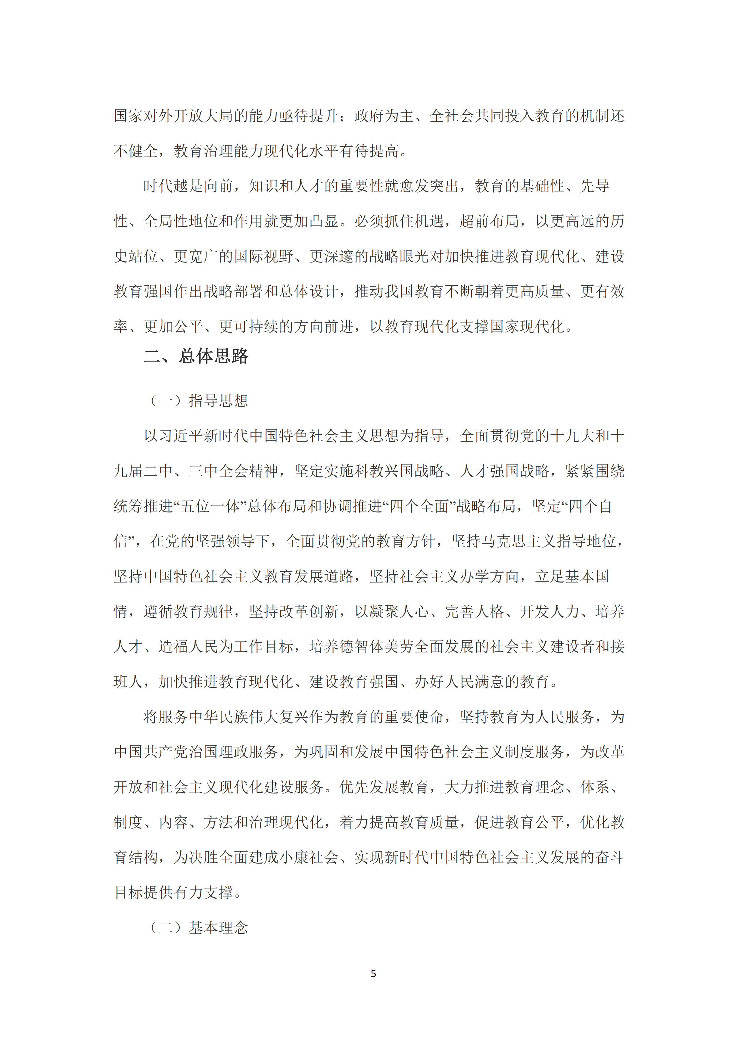 《中国教育现代化2035》分为五个部分:一、战略背景;二、总体思路;三、战略任务;四、实施路径;五、保障措施。