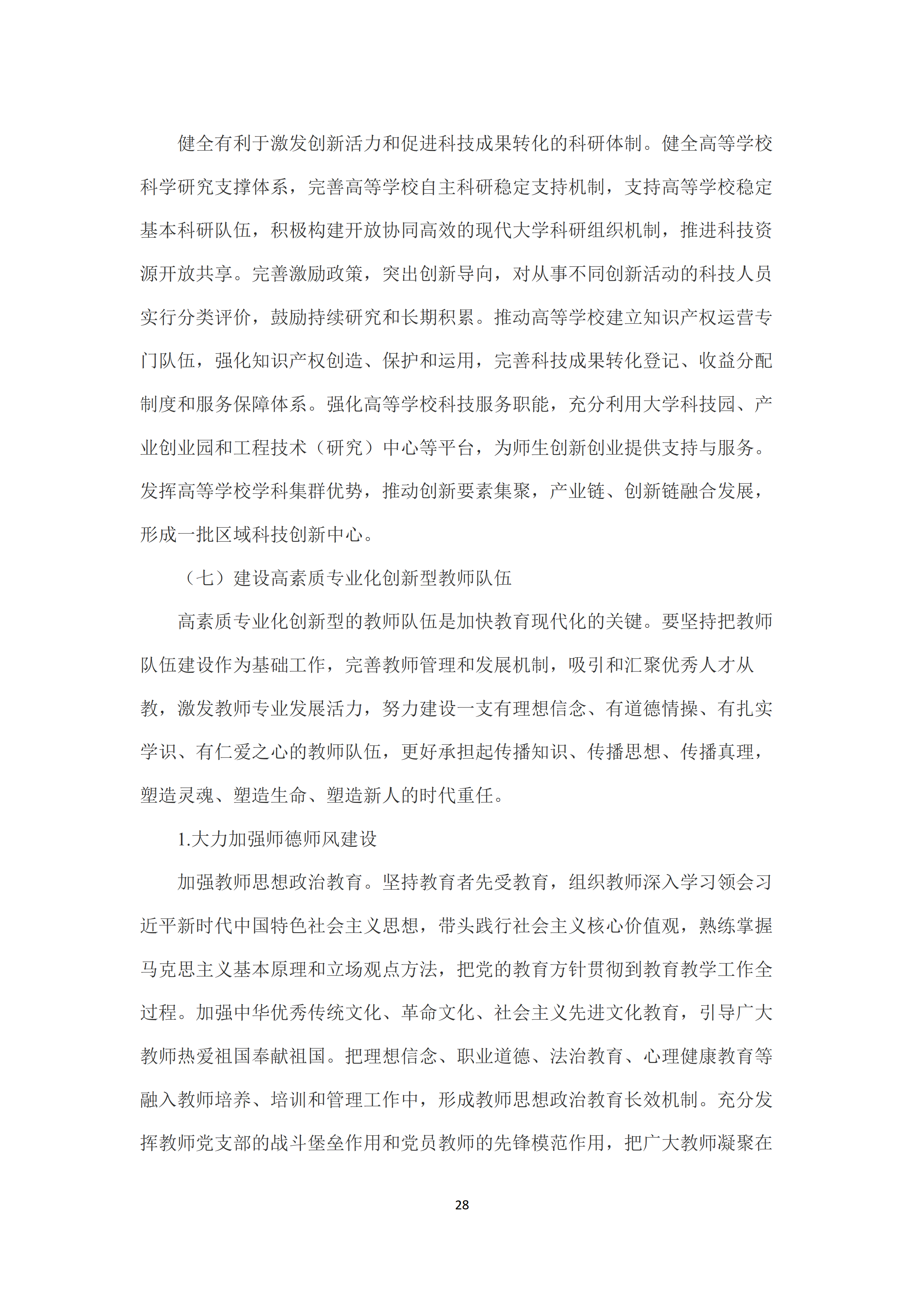 六是提升一流人才培养与创新能力。分类建设一批世界一流高等学校,建立完善的高等学校分类发展政策体系,引导高等学校科学定位、特色发展。持续推动地方本科高等学校转型发展。加快发展现代职业教育,不断优化职业教育结构与布局。推动职业教育与产业发展有机衔接、深度融合,集中力量建成一批中国特色高水平职业院校和专业。优化人才培养结构,综合运用招生计划、就业反馈、拨款、标准、评估等方式,引导高等学校和职业学校及时调整学科专业结构。加强创新人才特别是拔尖创新人才的培养,加大应用型、复合型、技术技能型人才培养比重。加强高等学校创新体系建设,建设一批国际一流的国家科技创新基地,加强应用基础研究,全面提升高等学校原始创新能力。探索构建产学研用深度融合的全链条、网络化、开放式协同创新联盟。提高高等学校哲学社会科学研究水平,加强中国特色新型智库建设。健全有利于激发创新活力和促进科技成果转化的科研体制。